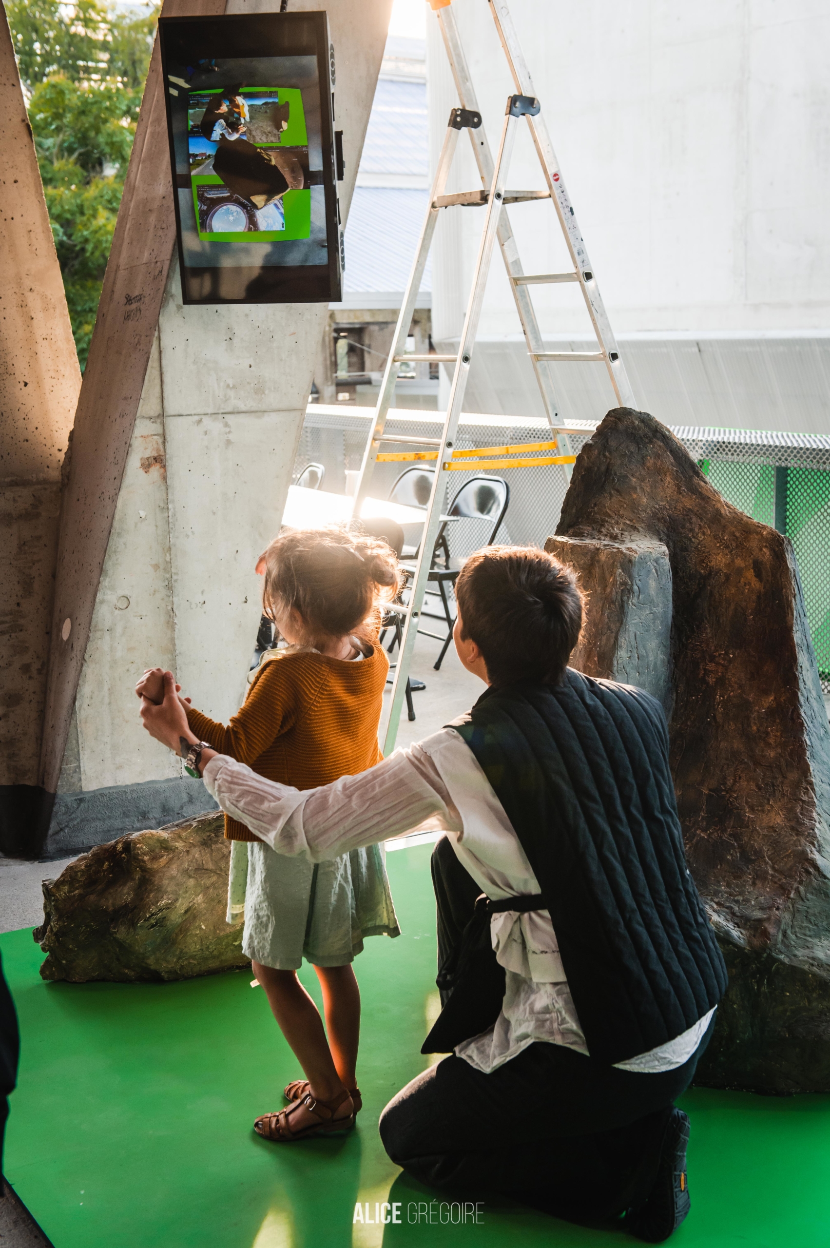 Le résultat, présenté sur la terrasse de Trempo jusqu’au 11 septembre, est un dispositif interactif où le public est invité à marcher sur un sol peint en vert, où se trouvent deux rochers. Grâce à la technique du chroma keying, le public est inséré dans un décor où des projections passent en boucle. Un écran placé sur un pylone lui permet de visualiser ses propres histoires et déambulations. « Nous voulions ouvrir une fenêtre sur d’autres possibilités, racontent les trois artistes. Le chroma keying est une technique simple pour infiltrer des endroits réels de manière virtuelle. » Quant au titre énigmatique de l’œuvre, Martina l’explique ainsi : « “Pierre, feuille, ciseaux” est un très vieux jeu, où les deux opposants ont les mêmes chances de gagner. Ce qui est spécial avec ce jeu, c’est la répétition et le fait de devancer le prochain mouvement de l’adversaire. C’est de la spéculation. Vous ignorez ce qu’il va faire. Mais, plus vous jouez, plus vous pensez deviner ce qu’il va advenir après. » On laisse aux visiteurs et visiteuses de la terrasse le soin de se plonger dans ce jeu.