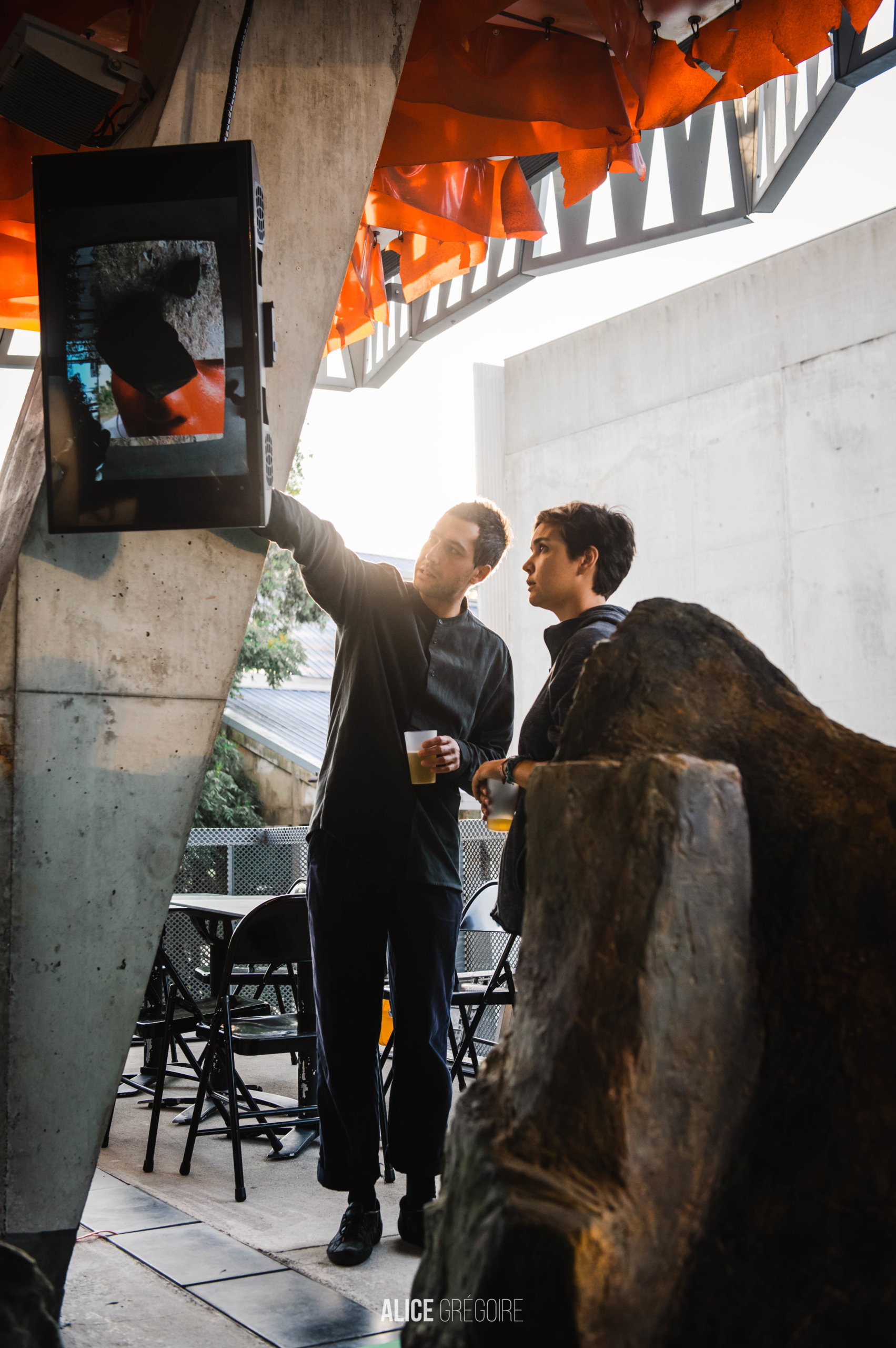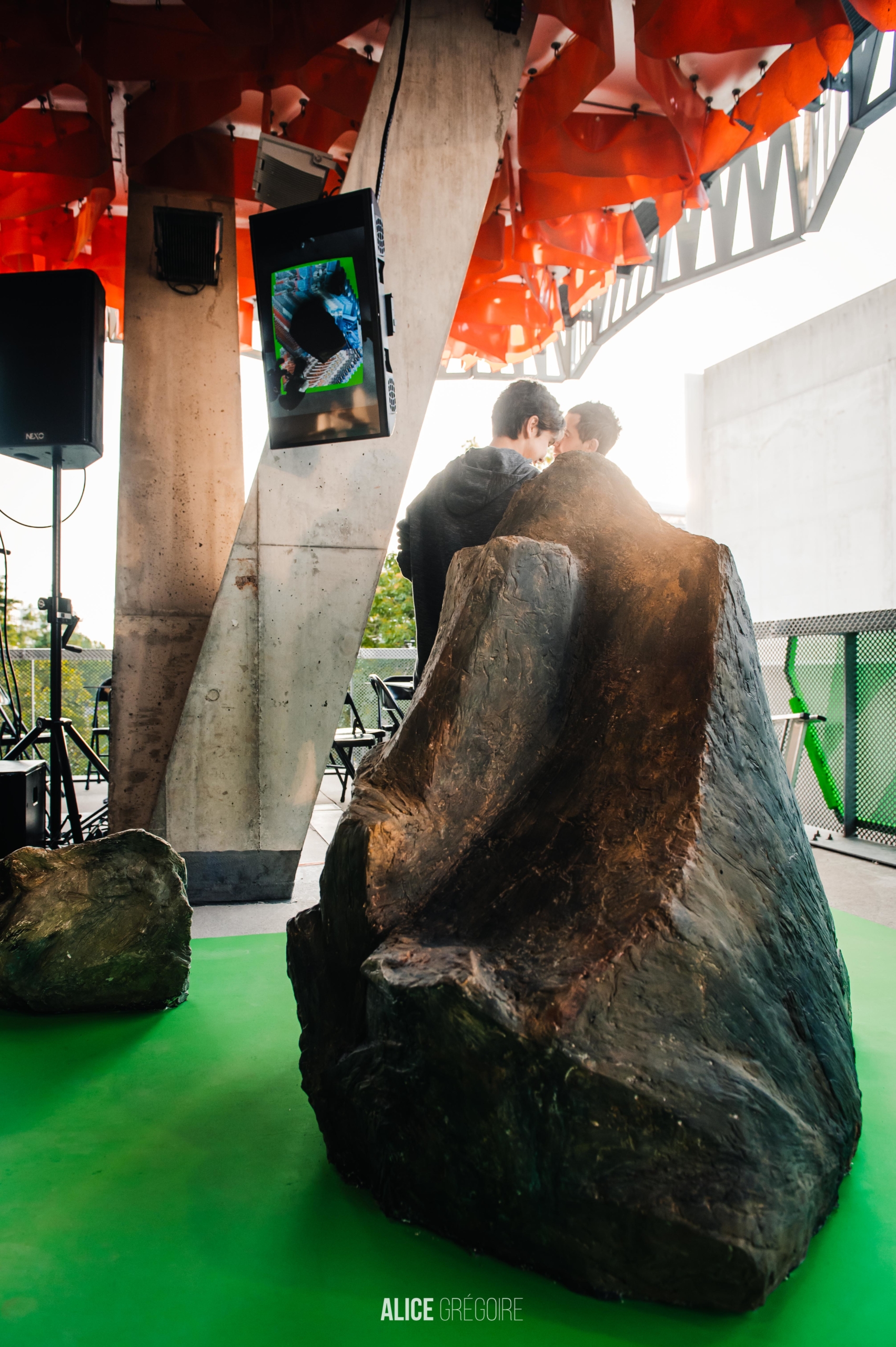 Pour concevoir Rock Paper Scissors, les artistes ont également collaboré avec 21 étudiant·es en DPEA scénographe de l’École Nationale Supérieure d’Architecture de Nantes (projet tutoré) et 7 étudiant·es en Master du Media Design Lab de l’école de Design Nantes Atlantique (projet tutoré). Au démarrage du projet, ils ont même contacté un facteur d’orgue pour envisager une dimension sonore à l’œuvre. « Quand nous avons commencé à plancher, tout était très ouvert, confie Fabian. On nous avait raconté que l’orgue de la cathédrale de Nantes avait été détruit en 2020 et c’était une piste initiale de travail, que nous avons finalement abandonnée. » Les artistes ont par ailleurs rencontré la sculptrice Maya Eneva, qui a conçu le rocher de l’œuvre. « Mettre cette pierre au milieu de Trempo nous paraissait évident : une pierre lourde sur ce bâtiment lourd qu’est cet ancien blockhaus… Mais les rochers pesaient trop lourd, justement, et il nous était donc impossible d’en monter un sur la terrasse. Nous avons décidé d’en réaliser une reproduction en polystyrène et cette tâche a été confiée à Maya. Ce n’est pas une copie d’une pierre existante : Maya s’est inspirée d’un petit caillou.»