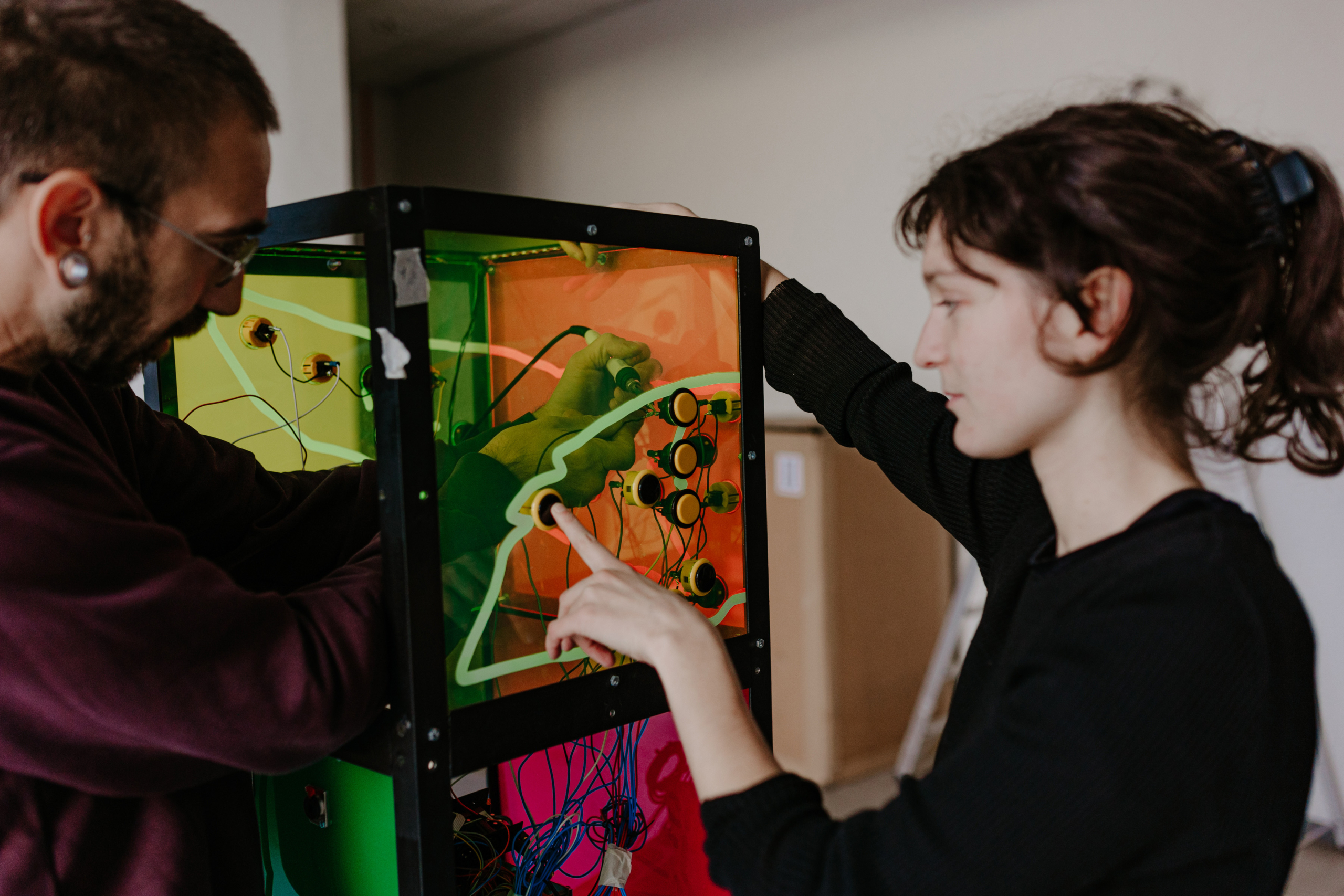 De nombreux·ses curieux·ses étaient présent·es à Tartu pour la performance de Thomas, Pauline, Janko et Fryderyk (qui à rejoint l’équipe artistique pour l’occasion). À ce moment, ce totem traduit parfaitement la symbolique de l’exposition, Superorganism. Janko Božović : “C’est drôle que l’exposition se soit appelée ainsi. L’œuvre n’était pas pensée comme telle mais il est vrai qu’elle comporte tous les éléments d’un super organisme. Son cerveau Bella, ses boutons, son chapeau…”